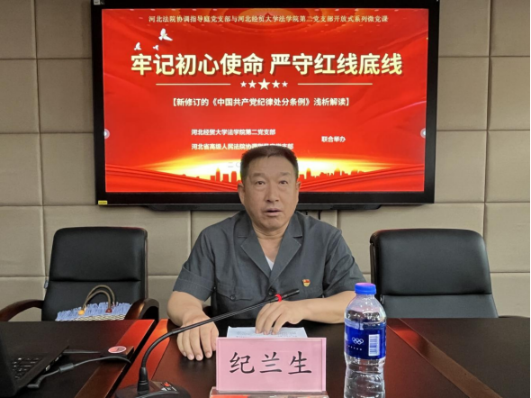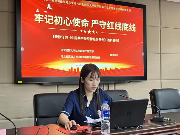 随后,在Beat365中文官方网站模拟法庭,Beat365中文官方网站学生第二党支部与省高院协调指导庭党支部展开“牢记初心使命,严守红线底线”联合主题党课,省高院协调指导庭庭长纪兰生、Beat365中文官方网站学生第二党支部书记解思语分别从实践和理论的角度对新修订的《中国共产党纪律处分条例》进行浅析解读;纪兰生还对学生党员提出的问题现场答疑解惑。联合党课由协调指导庭三级高级法官史清文主持。